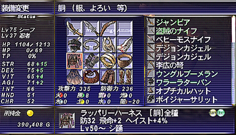 ●●ラッパリーハーネス(胴 防32 飛命+2 ヘイスト+4% Lv50~ シ踊)